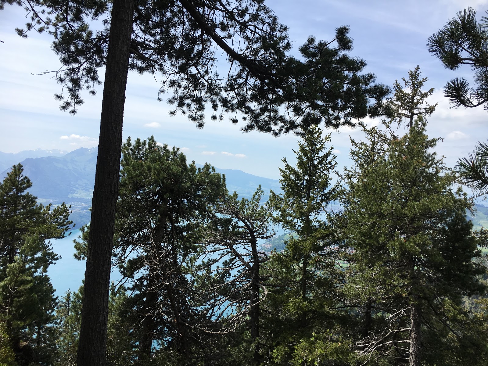 Schon nach wenigen Meter bietet sich uns eine tolle Aussicht auf den Thunersee. Da ich meine Kamera heute nicht dabei habe, muss das Iphone für Fotos herhalten. Ich mache bereits einige Fotos. Weiter geht es Richtung Beatenberg. Unterwegs treffen wir noch einen anderen Wanderer, der uns für kurze Zeit begleitet. Plötzlich bemerke ich, dass ich mein Iphone nicht mehr habe. Ich habe gerade noch Fotos gemacht, also kann ich es noch nicht lange verloren habe. Ich laufe 50 m zurück und finde das Iphone auf dem Waldboden. Glück gehabt sonst hätte ich keine Fotos mehr machen können.