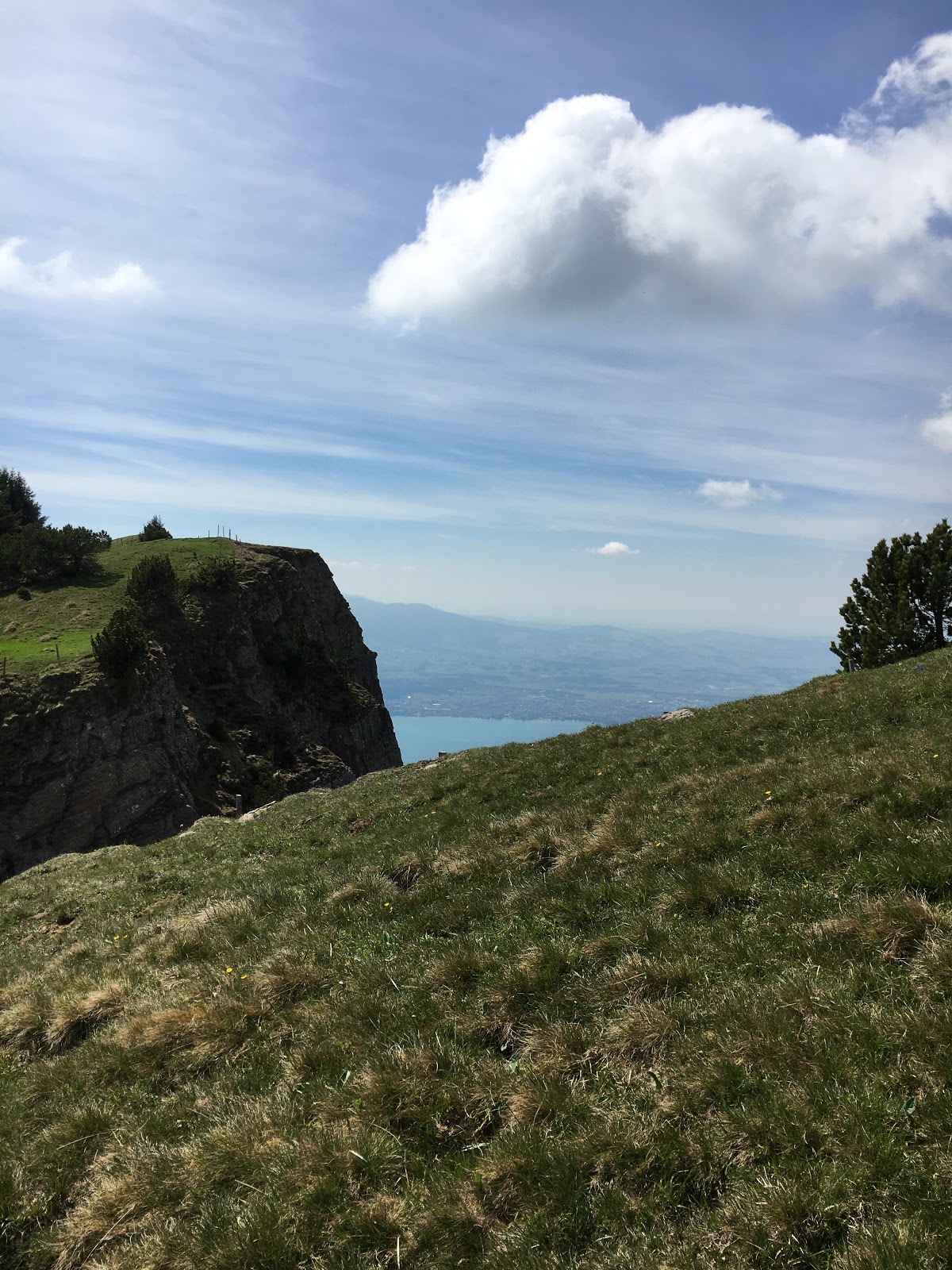 Wir beschliessen dann, dass wir doch bis auf das Niederhorn laufen und auf die Trottis wahrscheinlich verzichten. Aber kurz vor dem Ziel aufzugeben wäre auch doof. Also nehmen wir den Anstieg Richtung Niederhorn in Angriff. Laut der SchweizMobil App müsste der letzte Anstieg nicht mehr zu lange dauern. In etwas weniger als 2km sind wir am Ziel. Voller Motivation laufen wir also los. Nach nur wenigen Meter wird unsere Motivation aber gedämpft. Der Wegweiser informiert uns, dass es doch noch 1h zu laufen ist bis aufs Niederhorn. Wir haben noch überlegt mit der restlichen SponThun Gruppe in Thun etwas trinken zu gehen. Wir sagen dieses Unternehmen also nun einmal ab. Wir werden definitv nicht vor 16:00 auf dem Niederhorn sein. Immer weiter geht es hoch und ich komme doch auch ziemlich ausser Atem. Wir geniessen unterwegs immer wieder die Aussicht auf den Thunersee. Plötzlich bemerkt Rebi, dass sich auch auf der anderen Seite ein wahnsinnstoller Blick auf die Berge bietet. Fast hätten wir die Bergsicht verpasst. Bereits zu diesem Zeitpunkt ist klar, dass sich der Aufstieg mehr als gelohnt hat. Nach ungefähr 40 Minuten sehen wir unser Ziel. Der Rot-weisse Mast erhebt sich vor unseren Augen. Nur noch wenige Meter und wir sind am Ziel.
