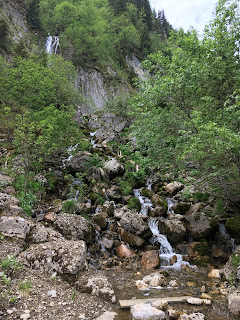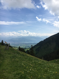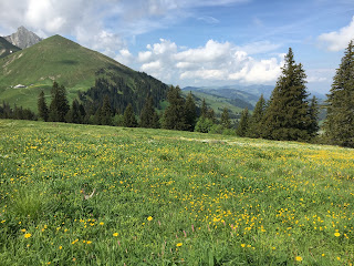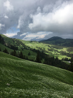 Wir starten bei der Wasserscheidi und laufen Richtung Blumenstein. Wir wandern bis zur Hütte Türliboden, wo Shila Ihr erstes Bad geniesst. Das Erste was ich wahrnehme ist der intensive Geruch. Es riecht nach Bergfrühling. Der Duft der Blumenwiese ist sehr intensiv, blumig und frisch. Ich würde diesen Duft am liebsten einpacken. Bis zur Hütte treffen wir relativ viele Wanderer. Die Meisten gehen dann aber Richtung Leiternpass. Wir nehmen den unteren Weg und laufen bis Obernünenen. Im Wald vom Girisberg laufe ich bei der Stelle vorbei, bei der ich im Januar übernachtet habe (Link). Wie sehr sich die Landschaft seither doch wieder verändert hat. Wir laufen durch den grünen Wald und da es nun doch sehr warm ist, sind wir froh um den Schatten. Nachdem wir den Wald verlassen verdunkelt sich der Himmel rasant. Natürlich habe ich genau heute kein Regenschutz dabei. Ich wusste, dass diese Tour nicht sehr weit ist und habe deshalb verzichtet etwas gegen den Regen mitzunehmen. Normalerweise habe ich meine Regenjacke immer dabei. Schliesslich weiss ich wie schnell sich das Wetter in den Bergen ändert. Nach wenigen Tropfen Regen verziehen sich die Wolken aber genauso schnell wie sie gekommen sind. Die Sonne kämpft sich wieder durch. In Oberwirtnere geniessen wir den Blick auf Thun. Wir laufen nun nicht mehr Richtung Blumenstein sondern schlagen die Richtung zur Tschingelflueh ein. Vorbei am Gürbefall geht es wieder Retour zur Wasserscheide. Ich geniesse die farbenprächtige Wiesen und versuche den Blick auf die weiss-gelb-violette-blauen Wiesen mit dem Iphone festzuhalten. Wie immer sind die Fotos aber nicht so intensiv wie das reale Bild. Dieser Rundweg dauert in einem gemütlichen «Shila- Tempo» etwas mehr als 2h. Es sind keine grosse Höhenunterschiede ( 320 Höhenmeter) und ist für fast jeden machbar. Die Aussicht auf Thun ist gerade bei Obernünenen einfach fantastisch. Da es doch eine Bergwanderung ist, ist gutes Schuhwerk aber sicher notwendig.