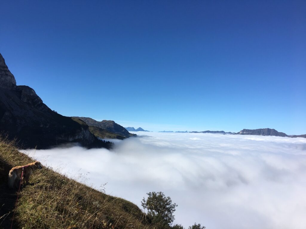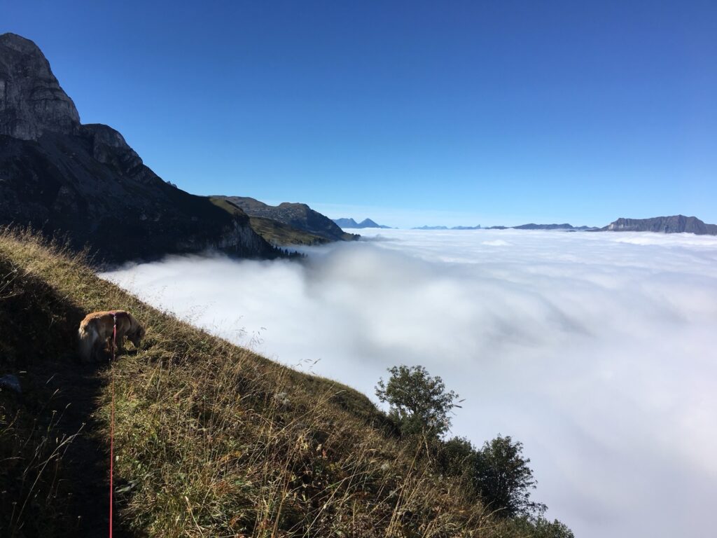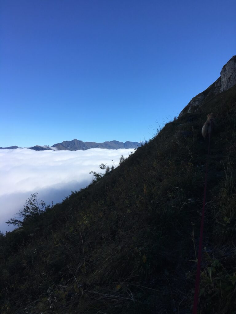 Vom See aus ging es anspruchsvoller weiter. Der Weg führte über steilere Passagen Richtung Uf der Fluh. Hier eröffneten sich spektakuläre Tiefblicke auf das Nebelmeer im Tal. Schmale, steinige Abschnitte erforderten etwas Trittsicherheit, belohnten aber mit unvergesslichen Panoramen.