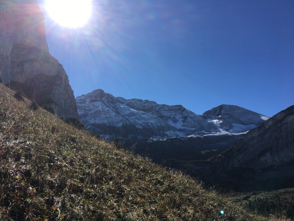 Der Startpunkt liegt oberhalb von Brienz auf rund 1500 m. Schon der erste Abschnitt über Alpweiden und durch lichte Wälder machte klar: Wir hatten die richtige Entscheidung getroffen. Während unter uns das Tal verschwand, führte uns der Weg direkt ins goldene Sonnenlicht.