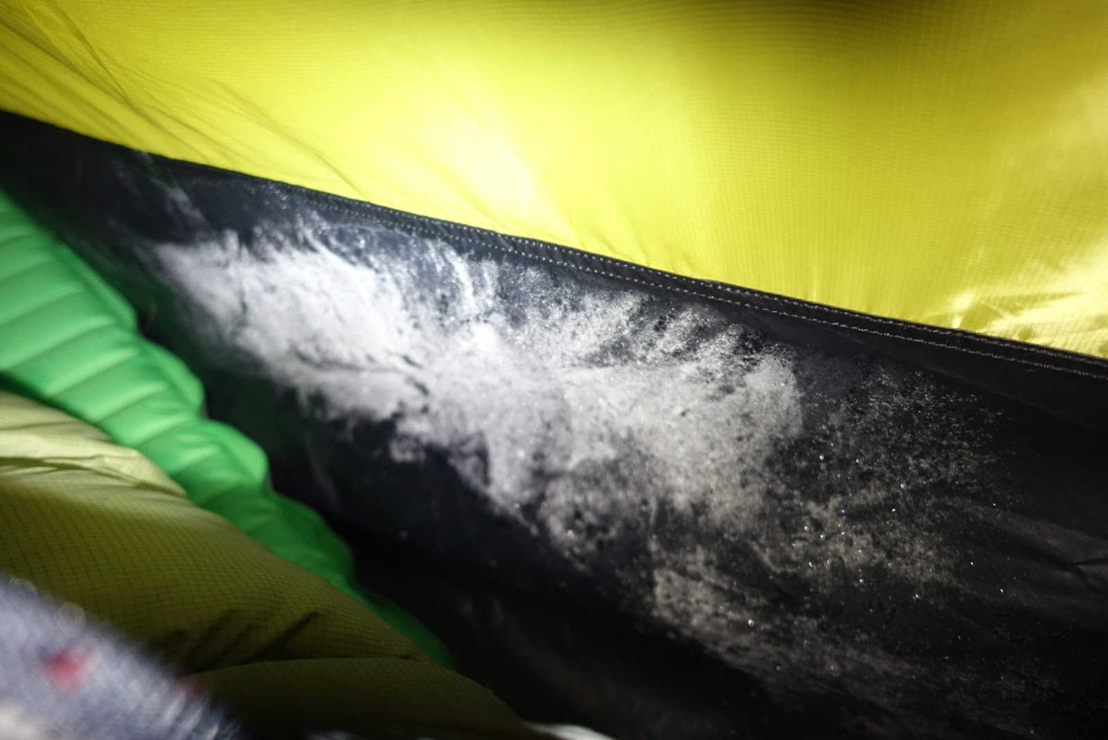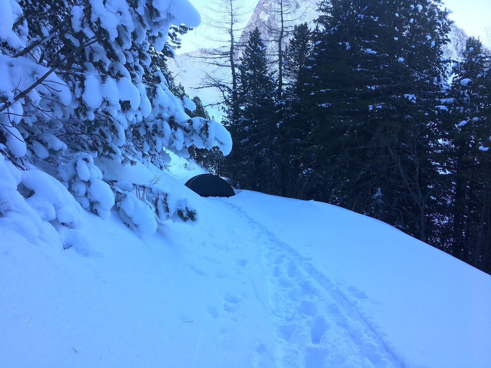 In der Nacht hatte ich einigermassen warm. Ein bisschen kälter als bei meinen vorderen Winterbiwaks war’s mir jedoch. Das Aufstehen am nächsten Morgen war dann ziemlich unmotiviert. Das Hilleberger Niak ist eigentlich kein Winterzelt, was man auch daran bemerkt hat das mein Zelt innen am Morgen gefroren war. Das Aufstehen und in die gefrorene Wanderschuhe zu steigen war für mich zu diesem Zeitpunkt der Horror. Ich habe mich kurz gefragt weshalb ich mir dies angetan habe. Mein Zelt abbrechen und alles einzupacken hat mir zu diesem Zeitpunkt nicht wirklich Freude bereitet. So habe ich beschlossen ohne Frühstück zurückzulaufen.