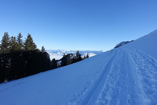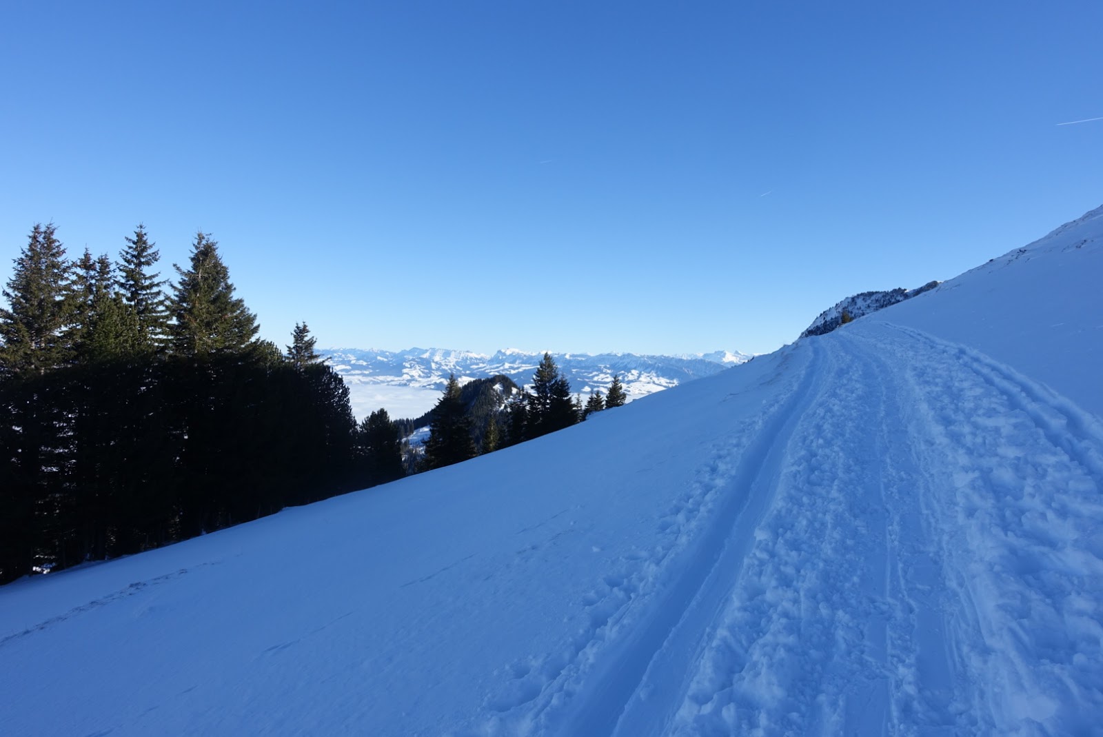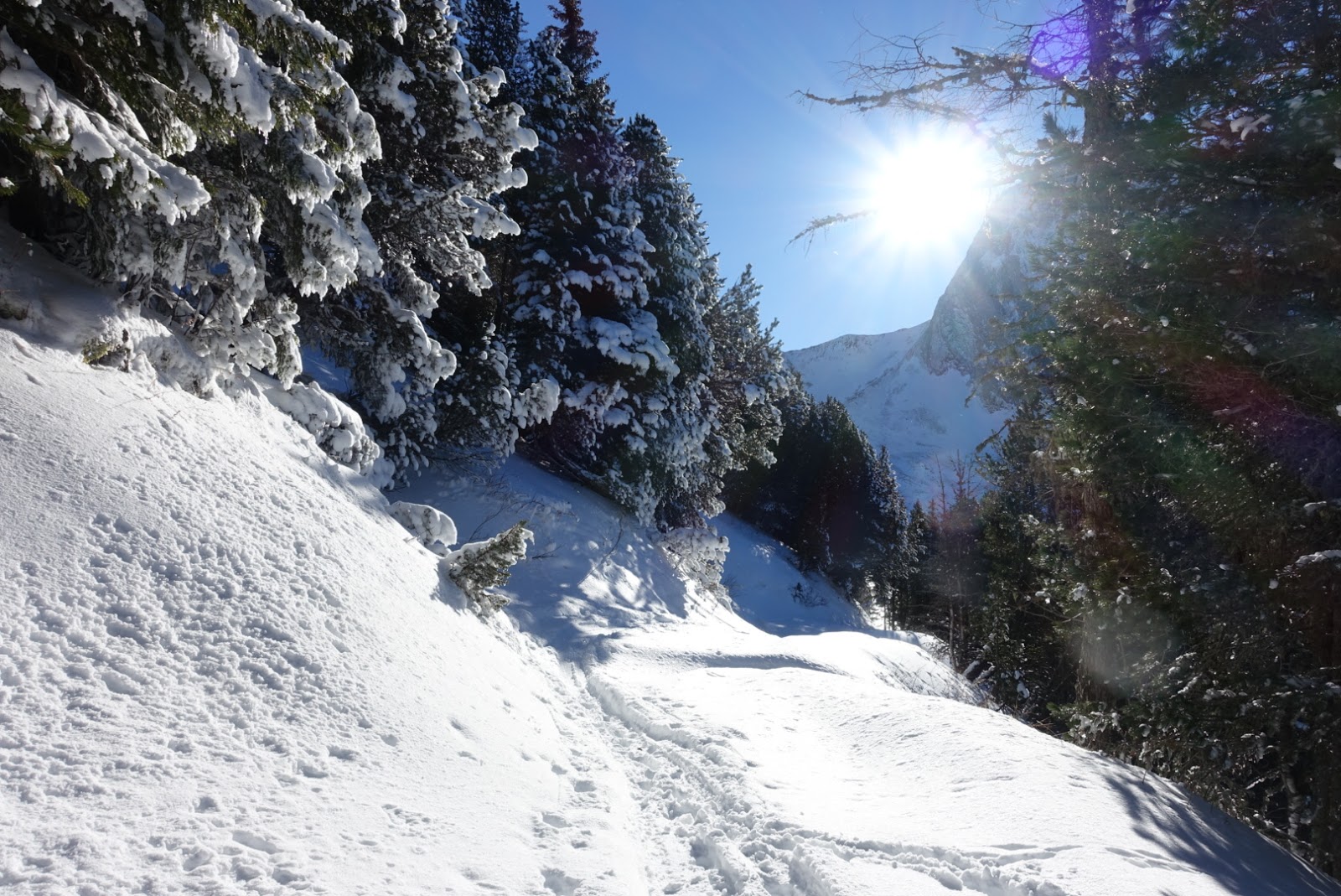 Ich konnte mir für den Aufstieg somit genügend Zeit nehmen und war in einem für mich passenden Tempo unterwegs. Nach einer Stunde kam ich an eine Stelle, die mir Herzrasen verursacht hat. Aufgrund der Spuren im Schnee war klar, dass an dieser Stelle bereits jemand ausgerutscht war. Zum Schluss habe ich diese Stelle sicherheitshalber auf allen vieren hinter mich gebracht. Kriechend habe ich mich langsam fortbewegt. Zum Glück stand an dieser Stelle noch eine kleine Tanne an der ich mich zusätzlich festhalten konnte. Von aussen sah diese Situation wohl ziemlich amüsant aus.