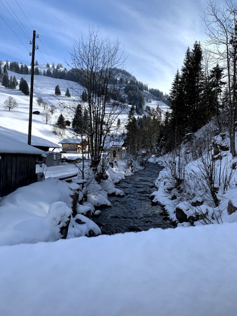 Ausgangspunkt der Winterwanderung ist der Parkplatz Senggiweide. Von hier aus sind es nur wenige Meter bis zum ersten kleinen Highlight: dem Blauseeli. Wichtig an dieser Stelle: Dieses Blauseeli darf nicht mit dem bekannten Blausee im Kandertal verwechselt werden. Es ist deutlich kleiner, dafür wunderbar ruhig und eingebettet in die Winterlandschaft der Grimmialp.