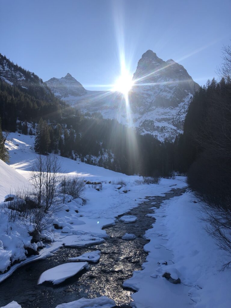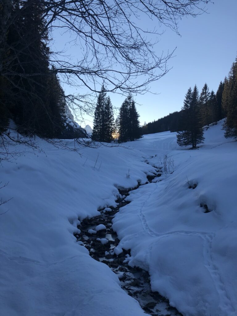 Wir haben in der Nähe von Zwirgi parkiert und sind von dort gemütlich losgewandert. Der Weg folgt zunächst dem Reichenbach talaufwärts – ein Abschnitt, der im Winter besonders still wirkt. Das Wasser bahnt sich seinen Weg durch Schnee und Eis, begleitet von verschneiten Bäumen und steilen Felsflanken.