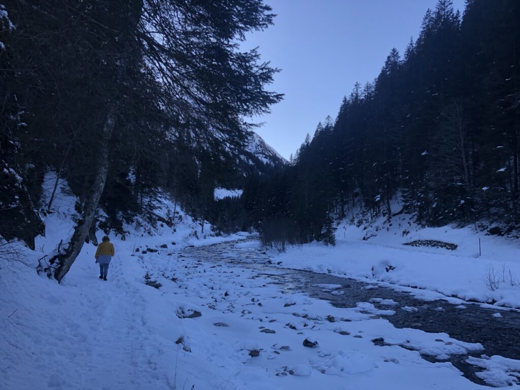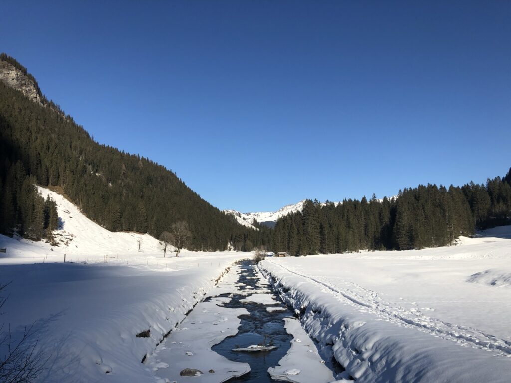 Anschliessend ging es auf der gegenüberliegenden Talseite wieder talwärts – sozusagen am einen Flussufer hinauf und am anderen zurück. Wir bewegten uns dabei leicht unterhalb des Romantikwegs. Während der Hinweg eher schattig war, konnten wir auf dem Rückweg die Sonne geniessen, was gerade im Winter ein grosser Pluspunkt ist.