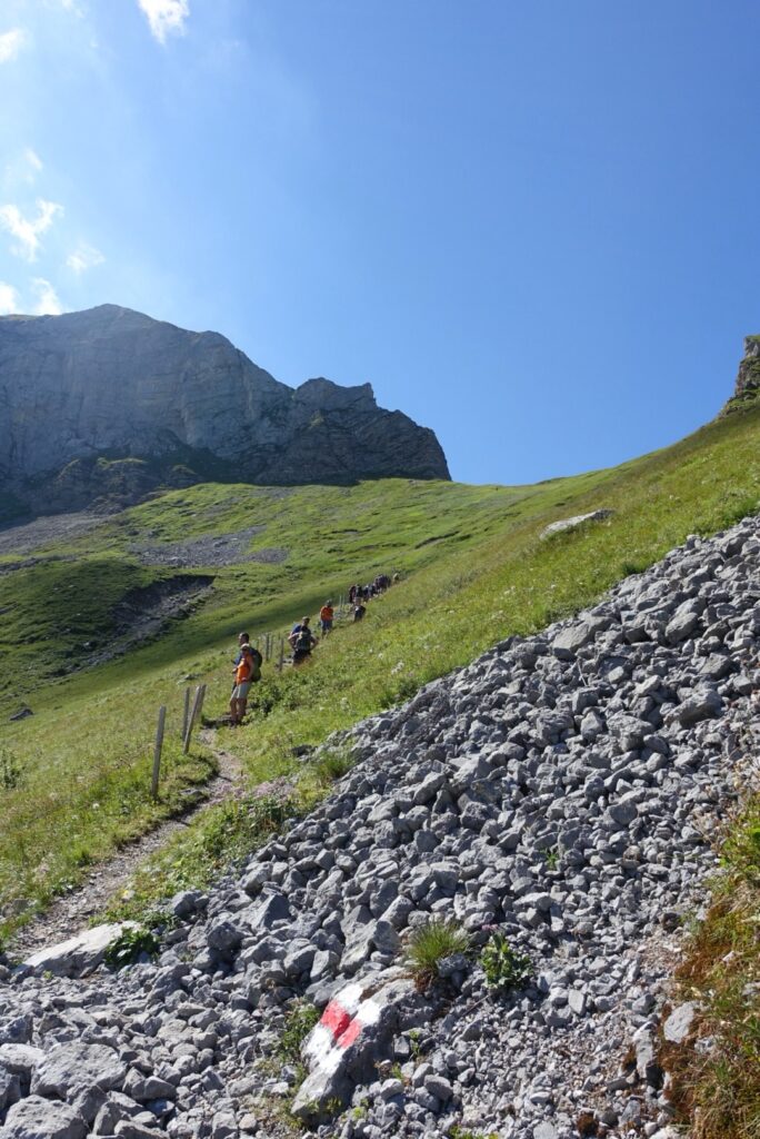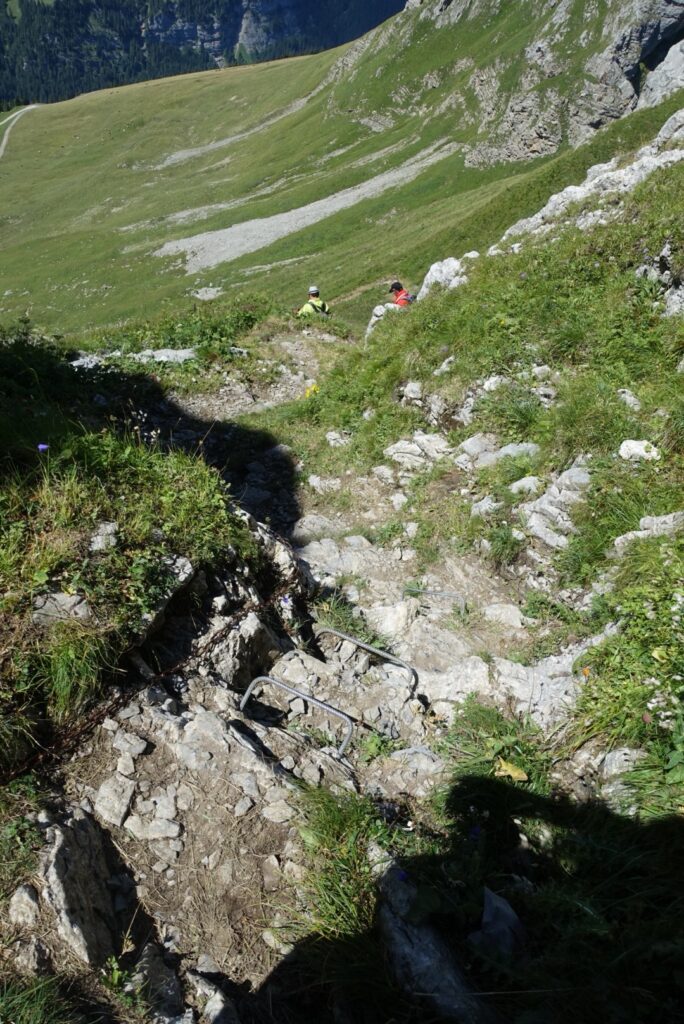 Der erste längere Anstieg fordert Kondition, danach folgt der letzte Abschnitt hinauf zum Abgschütz. Dieser ist teilweise mit Seilen gesichert und verlangt Trittsicherheit. Obwohl der Weg offiziell rot-weiss markiert ist, fühlt er sich stellenweise bereits sehr alpin an. Gutes Schuhwerk ist hier zwingend notwendig.