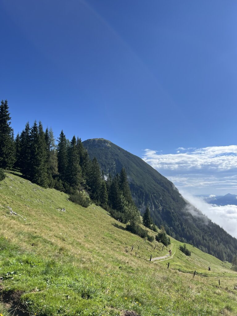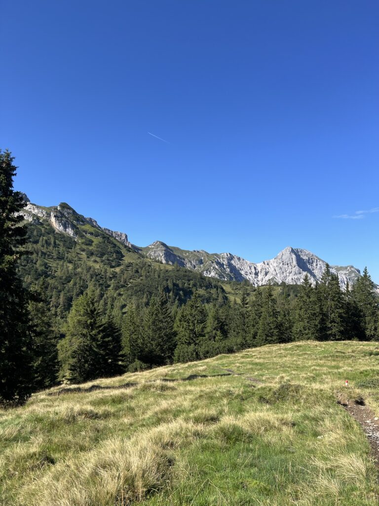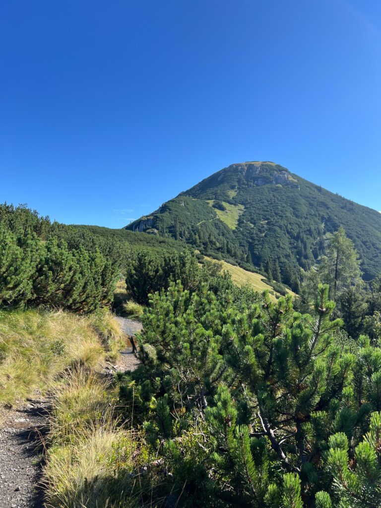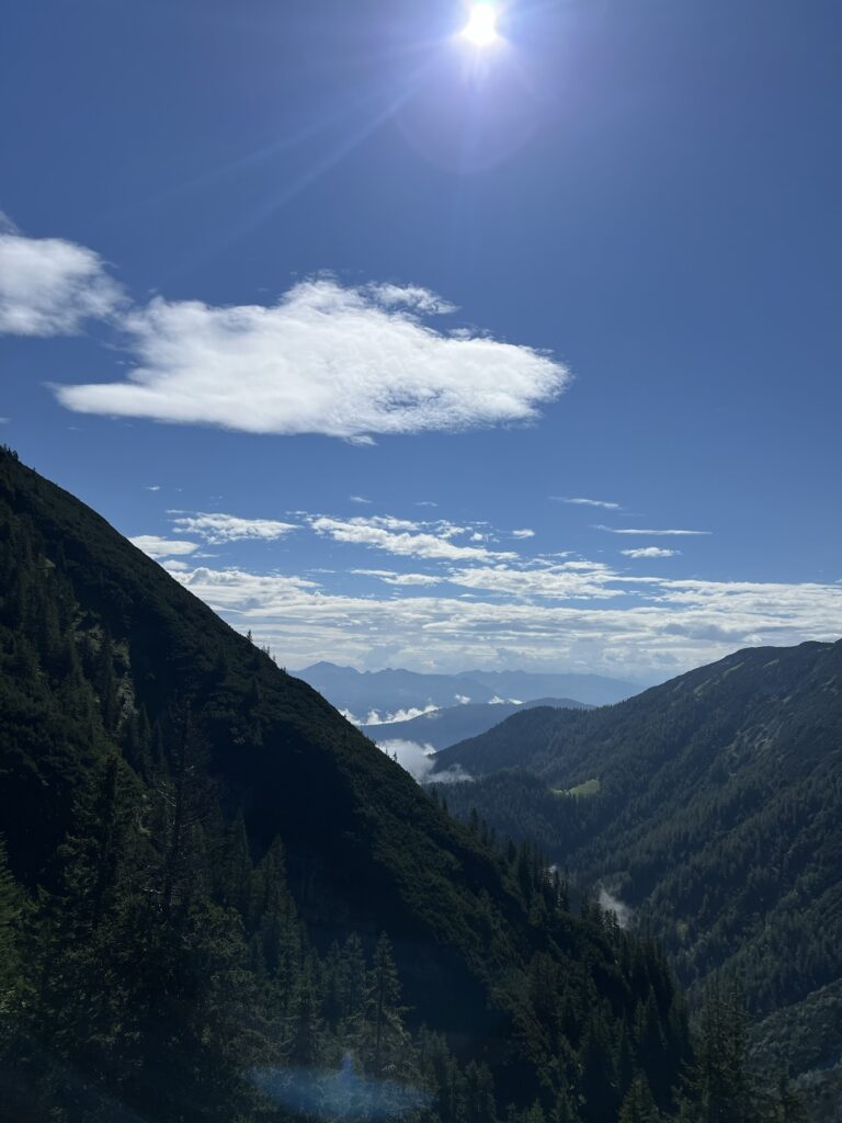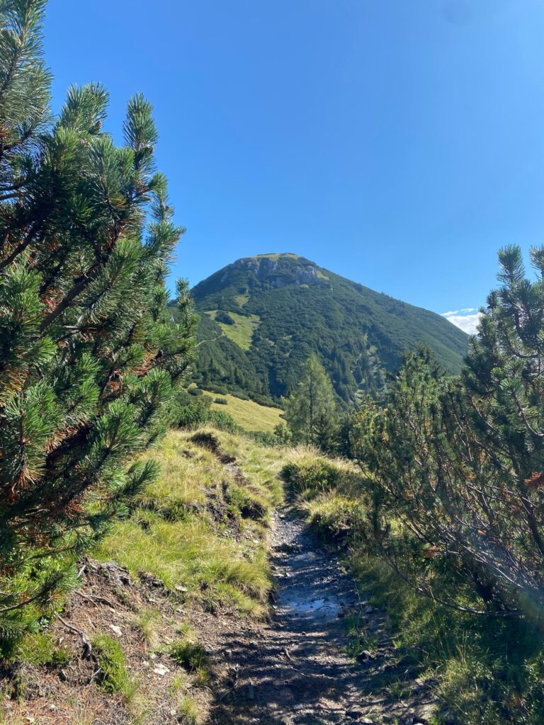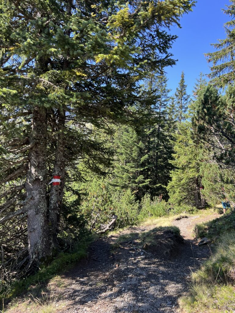 Früh am Morgen starteten wir mit der Gondel hinauf auf den Zwölferkopf. Von dort wanderten wir zunächst zur Bärenbadalm, einen Abschnitt, den wir inzwischen schon gut kannten. Danach ging es weiter durch den Wald Richtung Weissbachsattel. Dieser Weg ist weniger steil als die direkte Route zum Bärenkopf, aber dennoch fordernd. Für Mama und mich war der Aufstieg ziemlich knackig.