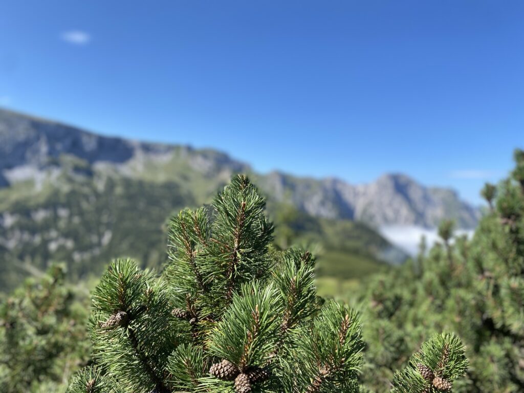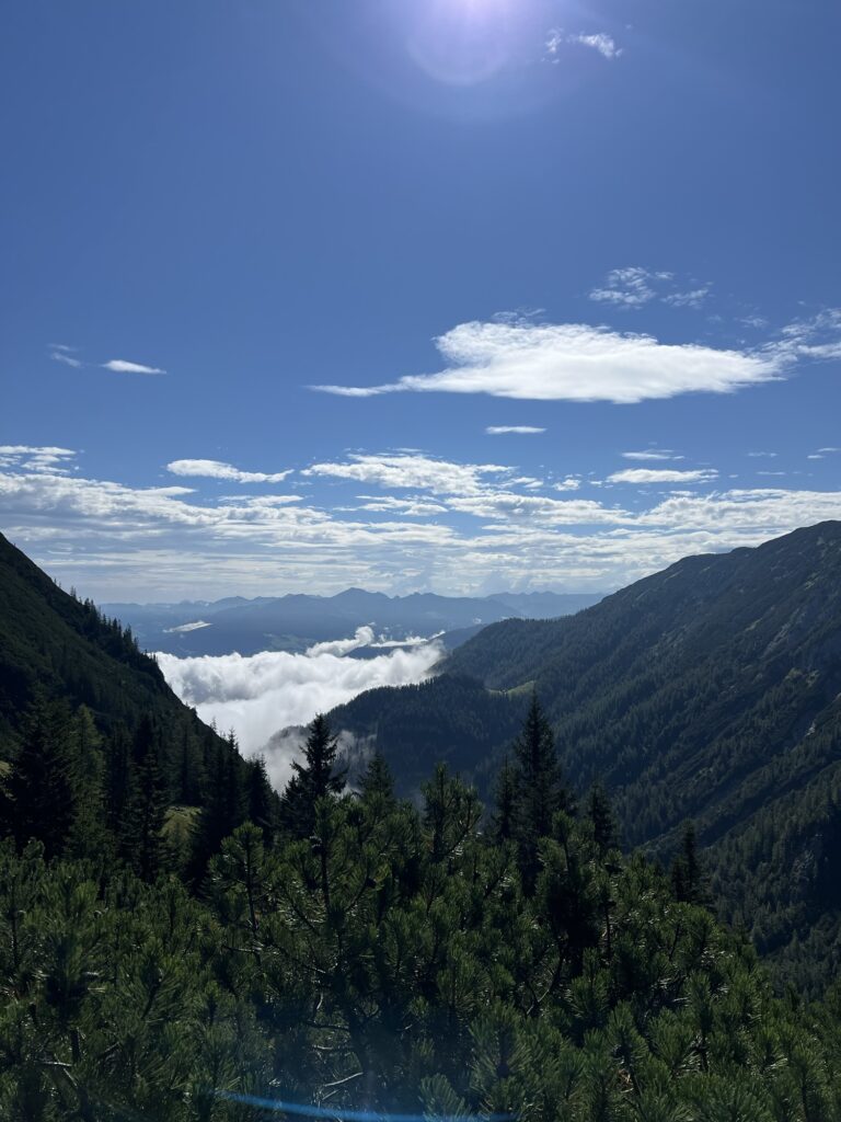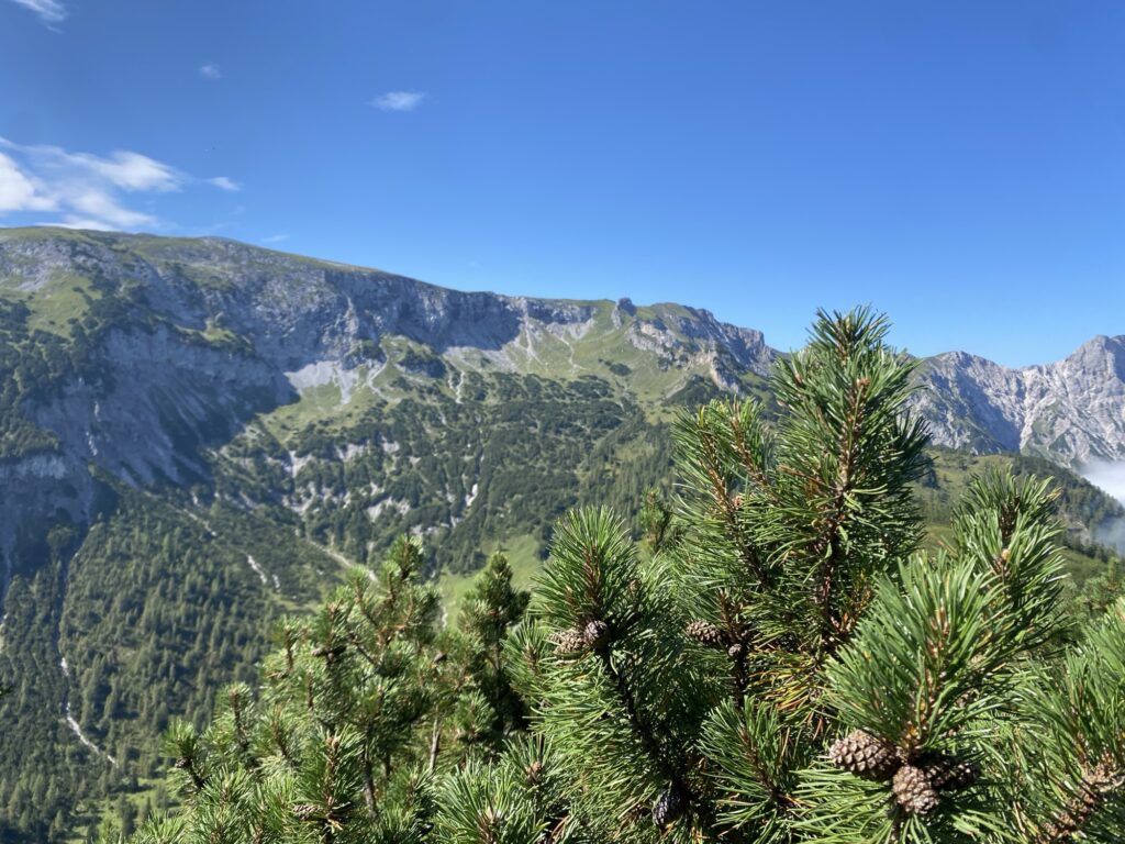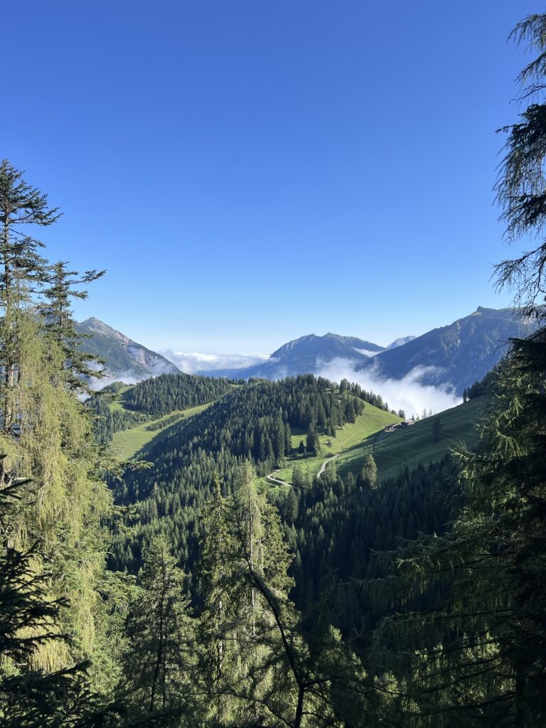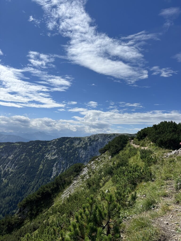 Früh am Morgen starteten wir mit der Gondel hinauf auf den Zwölferkopf. Von dort wanderten wir zunächst zur Bärenbadalm, einen Abschnitt, den wir inzwischen schon gut kannten. Danach ging es weiter durch den Wald Richtung Weissbachsattel. Dieser Weg ist weniger steil als die direkte Route zum Bärenkopf, aber dennoch fordernd. Für Mama und mich war der Aufstieg ziemlich knackig.