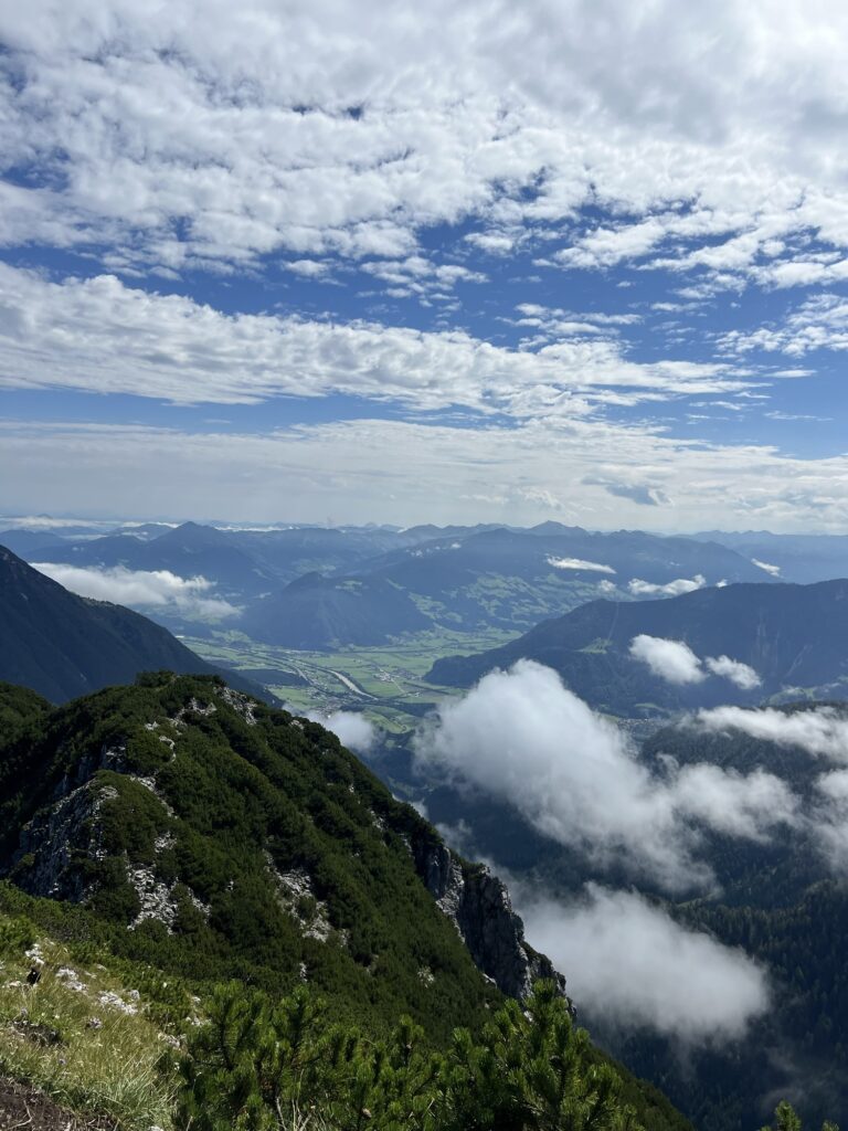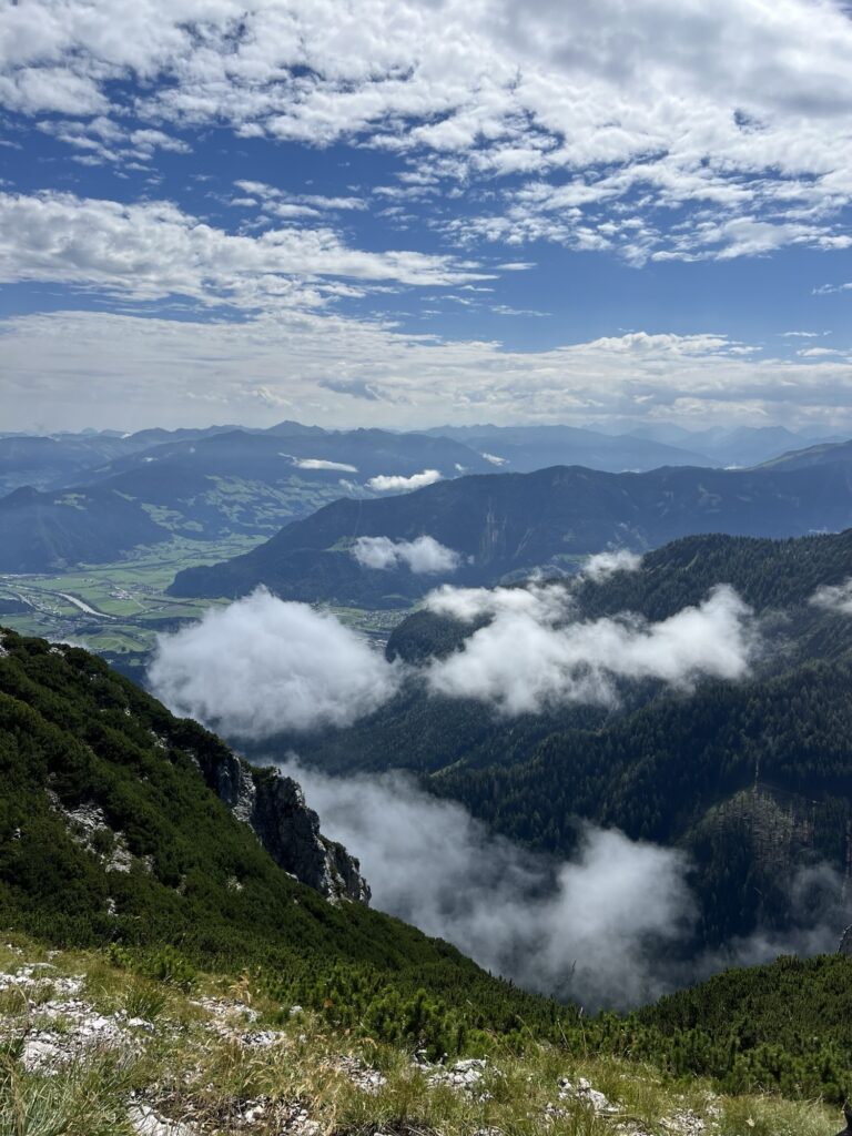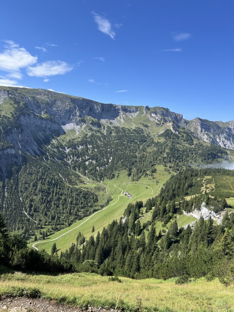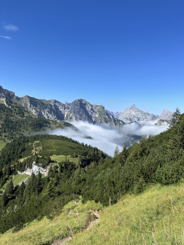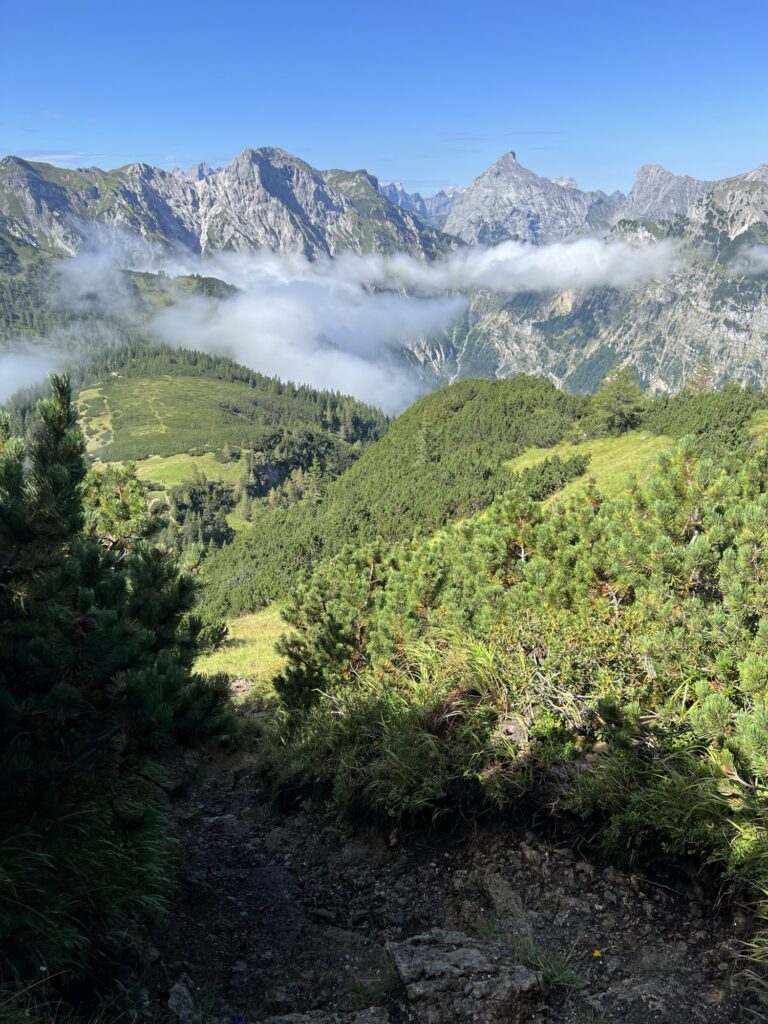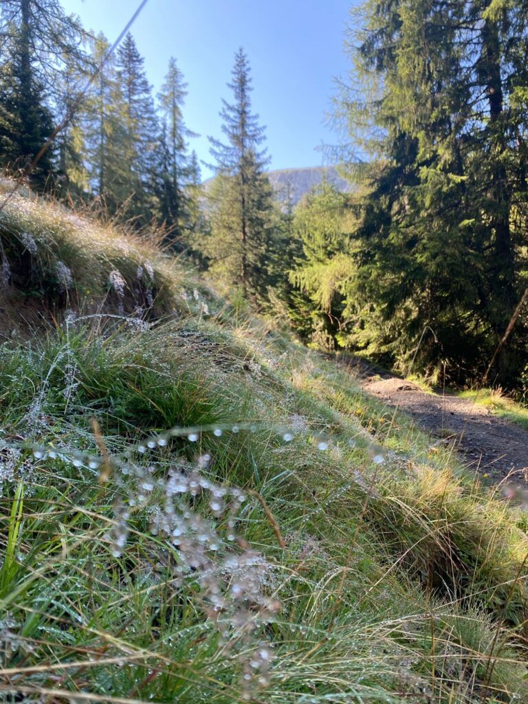 Früh am Morgen starteten wir mit der Gondel hinauf auf den Zwölferkopf. Von dort wanderten wir zunächst zur Bärenbadalm, einen Abschnitt, den wir inzwischen schon gut kannten. Danach ging es weiter durch den Wald Richtung Weissbachsattel. Dieser Weg ist weniger steil als die direkte Route zum Bärenkopf, aber dennoch fordernd. Für Mama und mich war der Aufstieg ziemlich knackig.